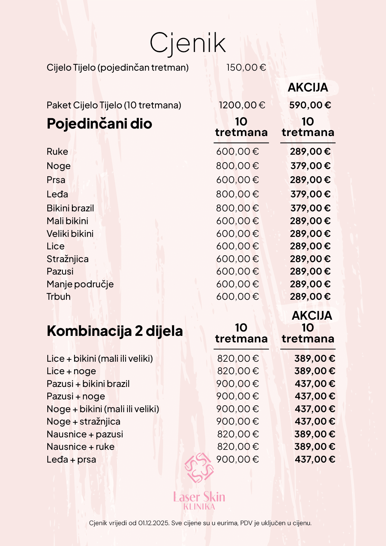 U Laser Skin klinici vjerujemo da kvalitetna i dugotrajna njega mora biti dostupna svima. Zato smo pripremili povoljne opcije za pojedinačne tretmane te iznimno atraktivan akcijski paket za cijelo tijelo.